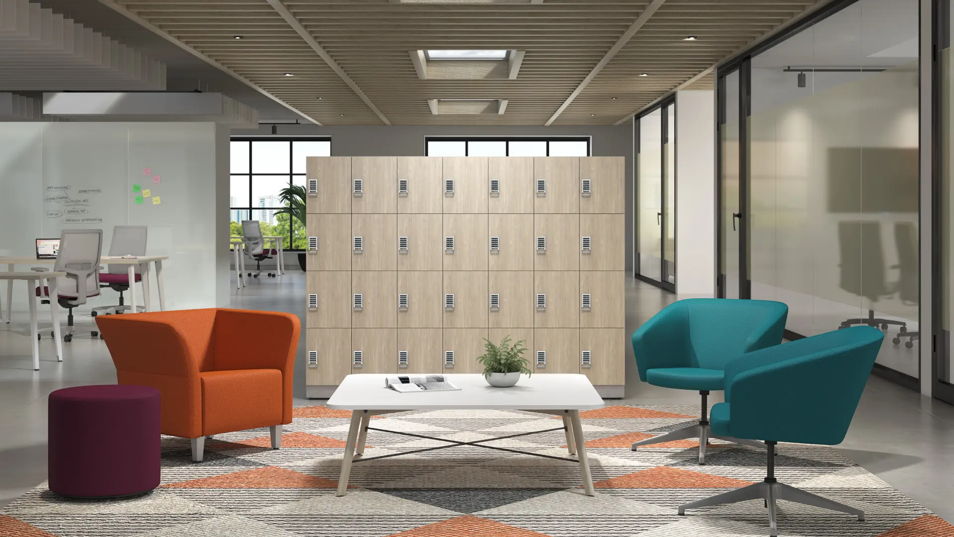Suits offices, wellness, and healthcare environments with a sleek finish and smart features like parcel pickup and reservation capabilities.